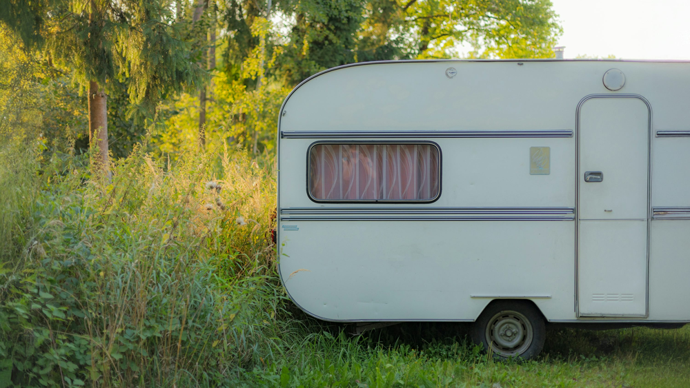 A vintage mobile home nestled in a lush forest clearing. Mobile homes to let often blend charming design with the serenity of nature, illustrating how affordable these rentals can be.